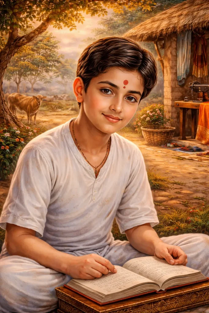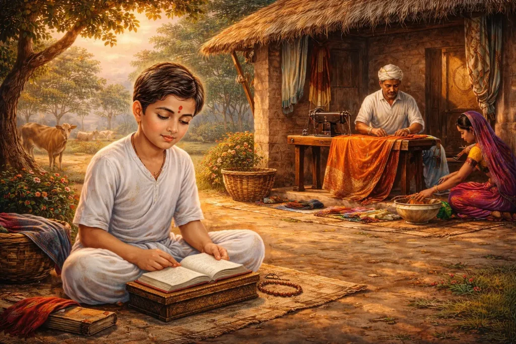 From childhood, Pragji displayed a deep spiritual inclination. Even while helping his family in their traditional occupation as a tailor and craftsman, he remained devoted to God and spiritual learning.